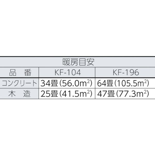 ・タンク容量(L):18・電源(V):単相100・本体寸法(mm)幅×奥行×高さ:444×649×685・暖房出力(kW/h):3.70〜9.57・ファン付・生産国 日本・JANコード 4963505126803・質量 18.6kgKF-104楽天 HD店